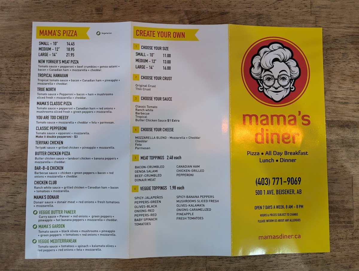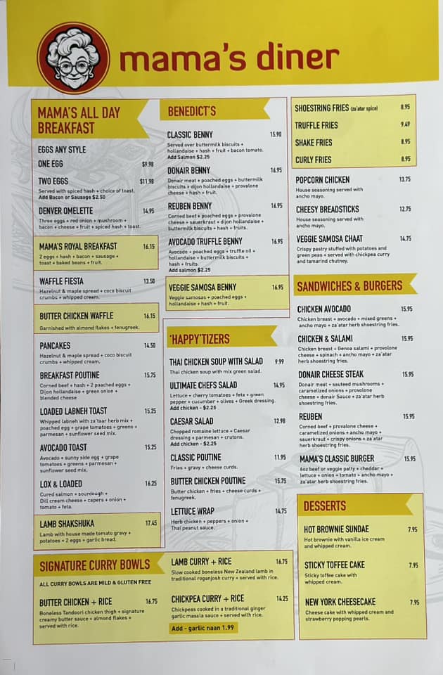 Mama's Diner in Beiseker offers a delightful variety of dishes that cater to every taste. The All Day Breakfast menu is perfect for those craving a hearty start, with options like Eggs Any Style (one egg or two eggs), the flavorful Denver Omelette, and the filling Mama's Royal Breakfast. For curry lovers, the Signature Curry Bowls feature dishes like Butter Chicken + Rice, Chickpea Curry + Rice, and Lamb Curry + Rice, all offering rich, comforting flavors. If you're in the mood for a twist on classic eggs Benedict, their Benedict's selection won’t disappoint, with choices such as Classic Benny, Donair Benny, Reuben Benny, and the unique Veggie Samosa Benny. For starters, try the Thai Chicken Soup with Salad, Caesar Salad, or the indulgent Classic Poutine and Butter Chicken Poutine. If sandwiches and burgers are more your style, options like Chicken & Salami, Donair Cheese Steak, Chicken Avocado Reuben, and the popular Mama's Classic Burger stand out. Satisfy your sweet tooth with a dessert like the decadent Hot Brownie Sundae, the rich Sticky Toffee Cake, or the creamy New York Cheesecake. For pizza lovers, the menu offers a range of options including the New Yorker's Meat Pizza, Tropical Hawaiian, and You Are Too Cheesy. With such a diverse and delicious menu, Mama's Diner provides something for everyone, whether you're in the mood for breakfast, comfort food, or a tasty dessert.